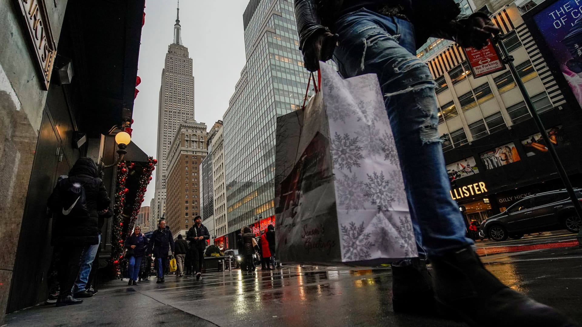 People carry shopping bags as they visit a department store during the holiday season in New York City.
