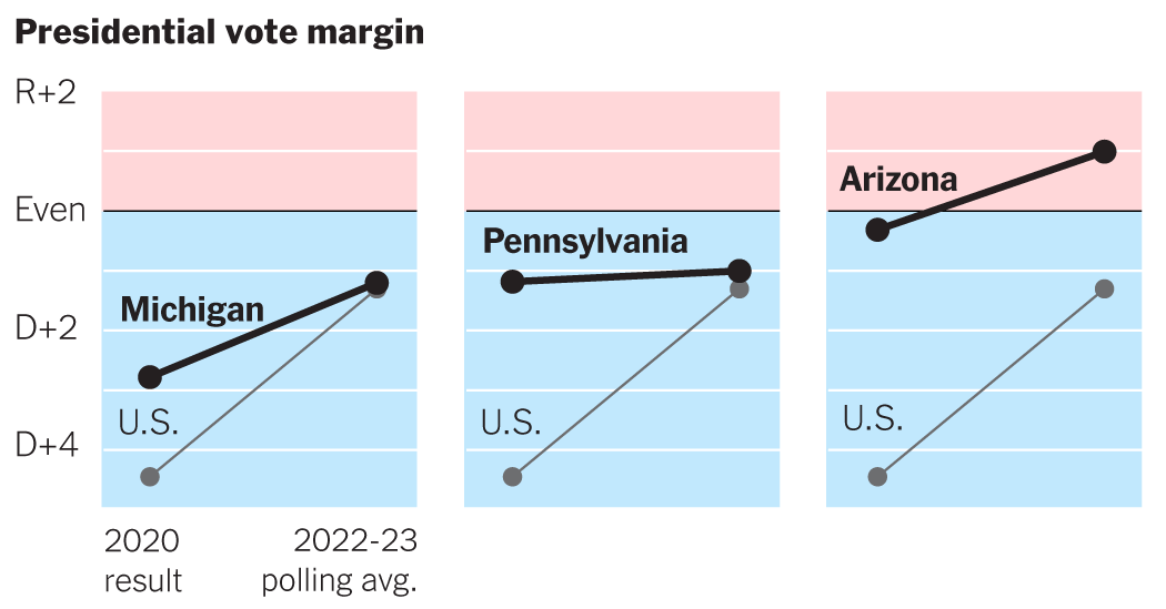 But there’s a case that his Electoral College advantage has faded. In the midterm elections last fall, Democrats fared about the same in the crucial battleground states as they did nationwide. And over the last year, state polls and a compilation of New York Times/Siena College surveys have shown Mr. Biden running as well or better in the battlegrounds as nationwide, with the results by state broadly mirroring the midterms.