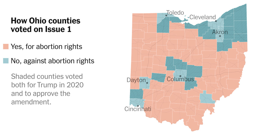 Ohio’s referendum on abortion rights drew support from both liberal and conservative areas of the state and won outright in 18 counties that President Donald J. Trump won in 2020, signaling the issue remains a weakness for Republicans.