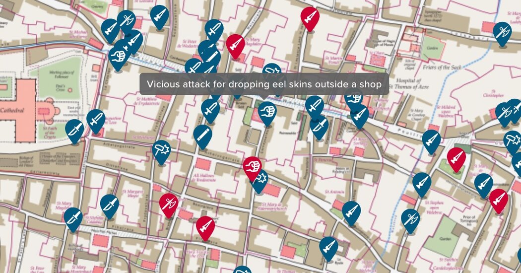 That tale is a favorite of Louise Grainger, who offers official guided tours around London. When taking visitors past the site where Mr. Styward died seven centuries ago, Ms. Grainger typically recounts the eel story. The murder map has also helped her add a story about a pub brawl to her walking tour around one of the city’s oldest markets, Leadenhall Market.