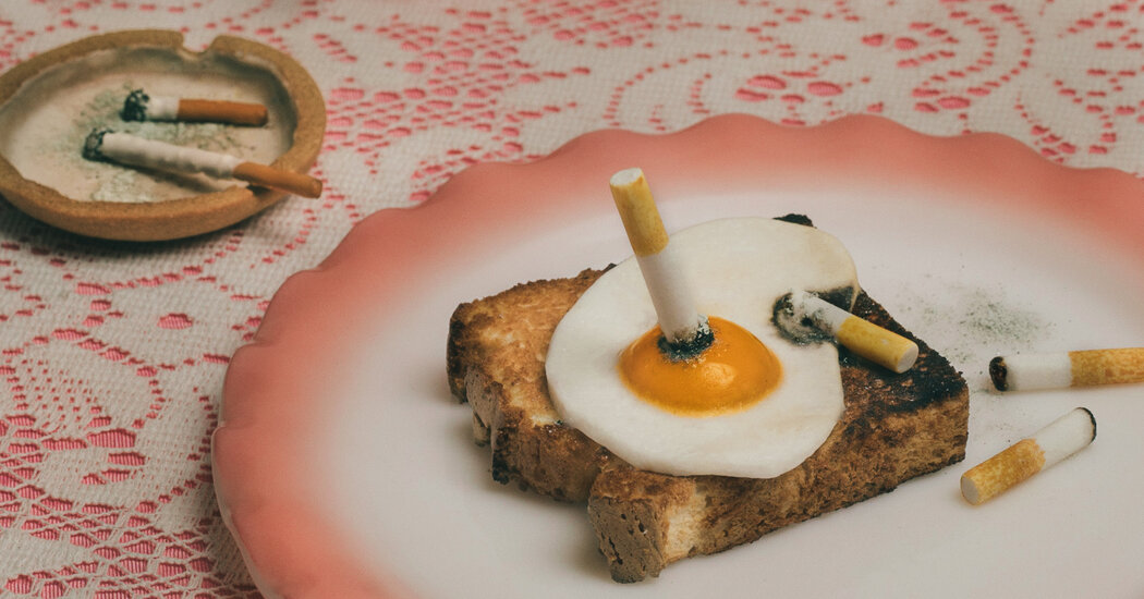 Whether it’s nostalgia, a backlash to wellness culture or a manifestation of existential anxiety, the cigarette is suddenly a pervasive presence in art, design and even food. The collector and curator Beth Rudin DeWoody, 71, says that young artists “are returning to old images of cigarettes in ads and films from the ’60s and ’70s that are so glamorous and striking — if you took away the actual poison of the cigarette.” In December, she curated a cigarette-themed show at her private art space, the Bunker, in West Palm Beach, Fla., including pieces from contemporary artists such as the painters Ana Benaroya and Danielle McKinney, as well as seminal works like Claes Oldenburg’s drawing “Design for a Bowling Alley in the Form of Cigarette and Smoke” (1968).