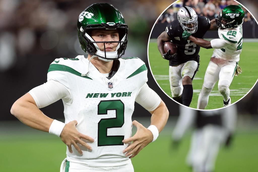 The Jets quarterback had the team in position to pull out a comeback win over the Raiders but an interception by Raiders linebacker Robert Spillane at the Las Vegas 15-yard line with 1:22 left sealed a 16-12 Jets loss.